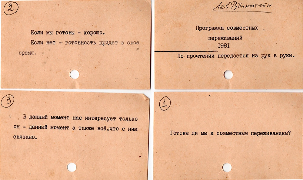 Будем считать, что это первый шаг в направлении такой подборки. И первым героем пусть будет Лев Рубинштейн. В его знаковом библиотечно-картотечном методе есть серия «Программа совместных переживаний» (1981). 36 карточек, в которых важное место отведено данному моменту — то, чему уделяется внимание и во всех практиках внимательности и осознанности. Мы направляем внимание на происходящее в этот самый момент и то, что с нами происходит в нём. Ключ всех майндфулнес-техник — именно в этом.